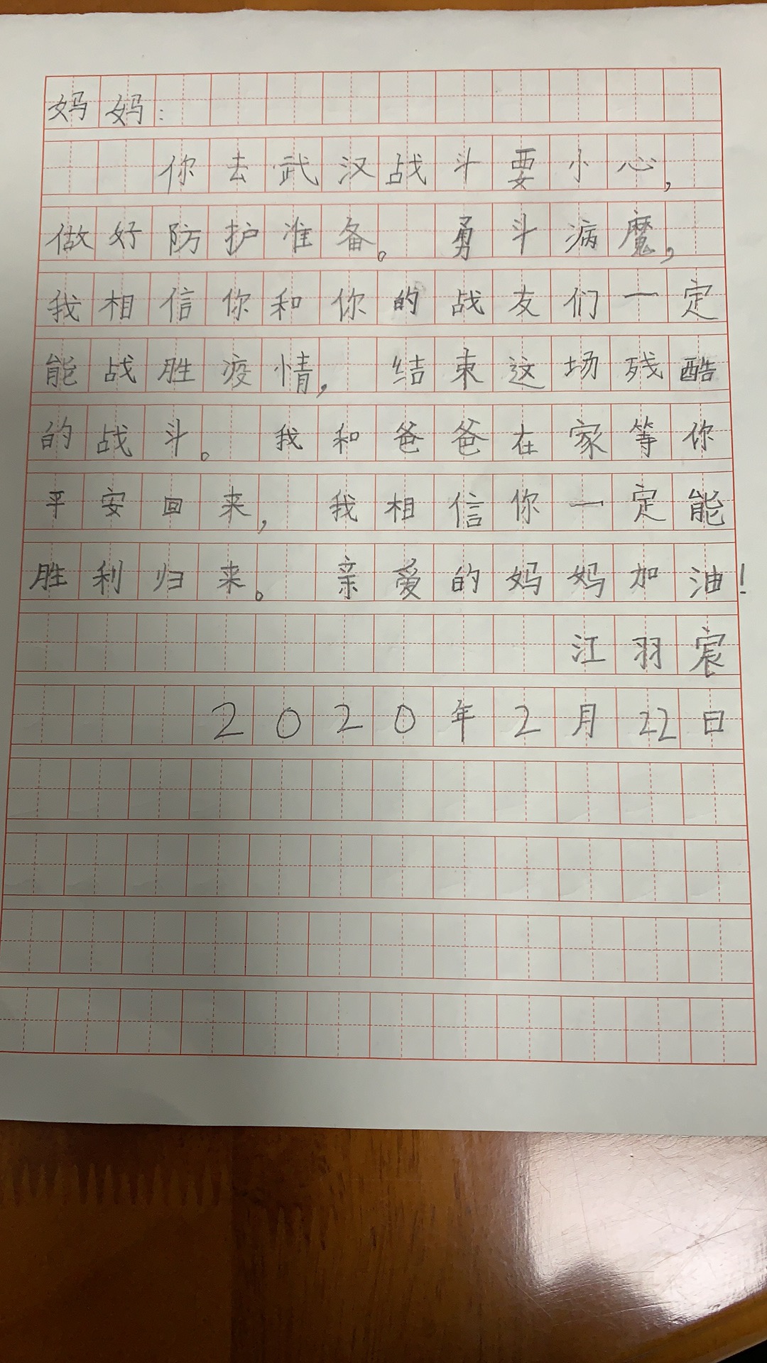 “媽媽,我相信你和你的戰(zhàn)友們一定能戰(zhàn)勝疫情,我和爸爸在家等你平安回來!親愛的媽媽加油!”這是我來到武漢的第三天,睡前看到老公發(fā)來兒子寫的信,我竟然失眠了,躺在床上輾轉(zhuǎn)反側(cè)。記憶中,兒子還是那個會纏著我鬧吵著要我陪的小不點兒,沒想到一轉(zhuǎn)眼竟已長成了小小男子漢。